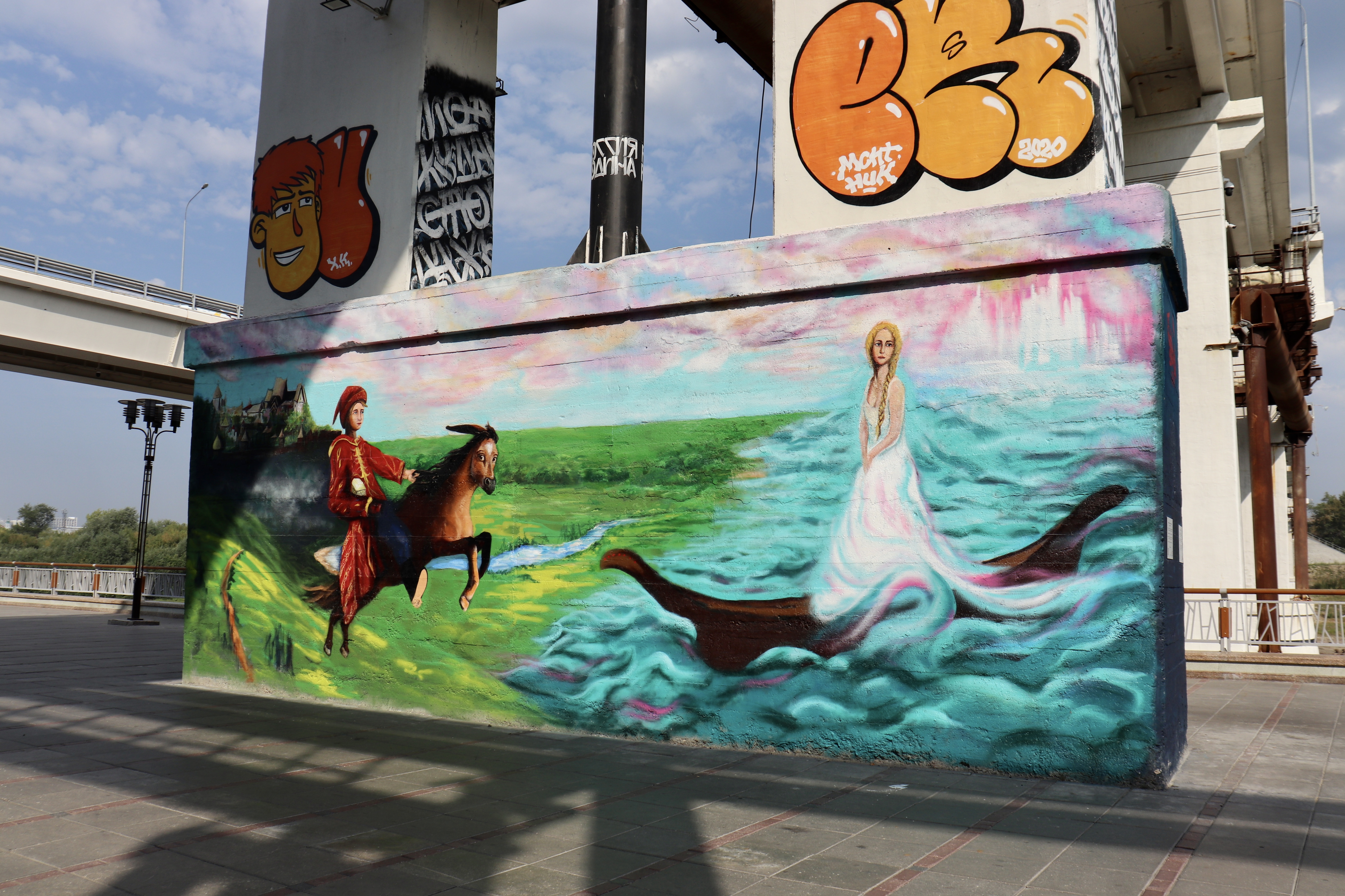 Уличный художник Влад Тахтау завершил работу над Коньком-Горбунком. Стрит-арт расстилается на опоре моста Челюскинцев, на правой стороне городской набережной.