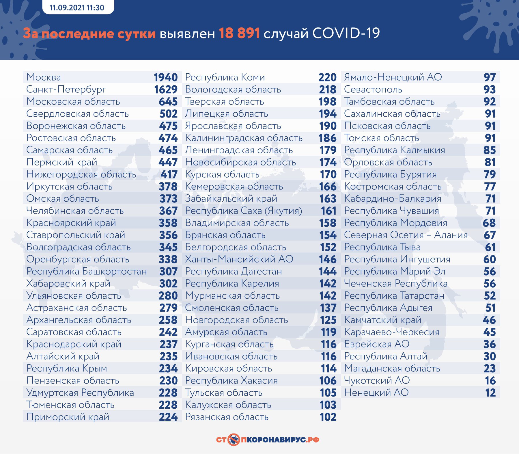 За тот же период по всей стране выявлено 18 891 случай COVID-19, причем 1 425 человек, двенадцатая часть зараженных, болеют бессимптомно. Из больниц выписано 17 888 россиян, а под наблюдением врачей находятся больше миллиона, 1 123 703. За сутки скончались 796 человек.