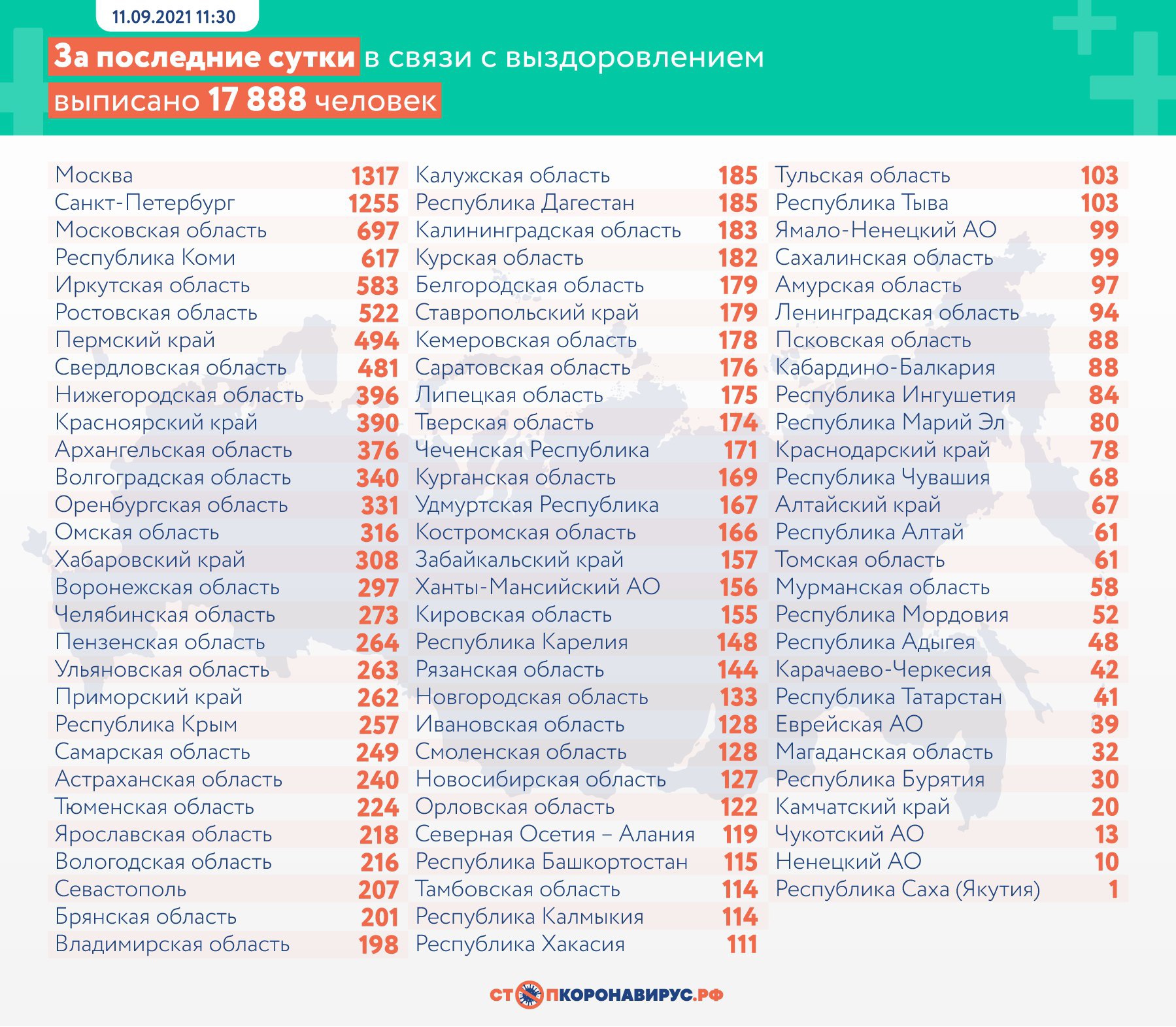 За все время пандемии в России зарегистрировано 7 121 516 случаев коронавирусной инфекции, а число выписанных пациентов выросло до 6 375 160. Количество летальных исходов составляет 191 961 человек.