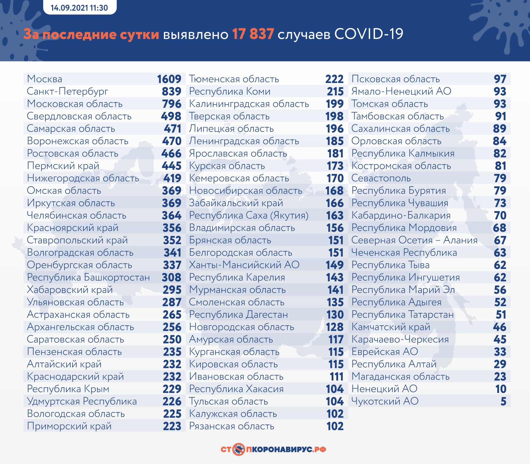 По данным федерального оперштаба на 14 августа, за сутки в России COVID-19 заболели 17 837 человек, 15 907 пациентов выздоровели, 781 человек умер. За весь период количество заразившихся россиян увеличилось до 7 176 085, выписаны по выздоровлению 6 418 033 пациента. На сегодняшний момент от осложнений болезни погибли 194 249 человек.