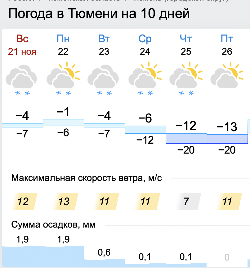 Также в ближайшие будние дни в городе поднимется преимущественно западный ветер, который может достичь 23 метров в секунду. Относительно безветренным будет лишь четверг, 25 ноября, а больше всего осадков ожидается в самом начале недели — небольшой снегопад пойдет уже в понедельник, 22 ноября.