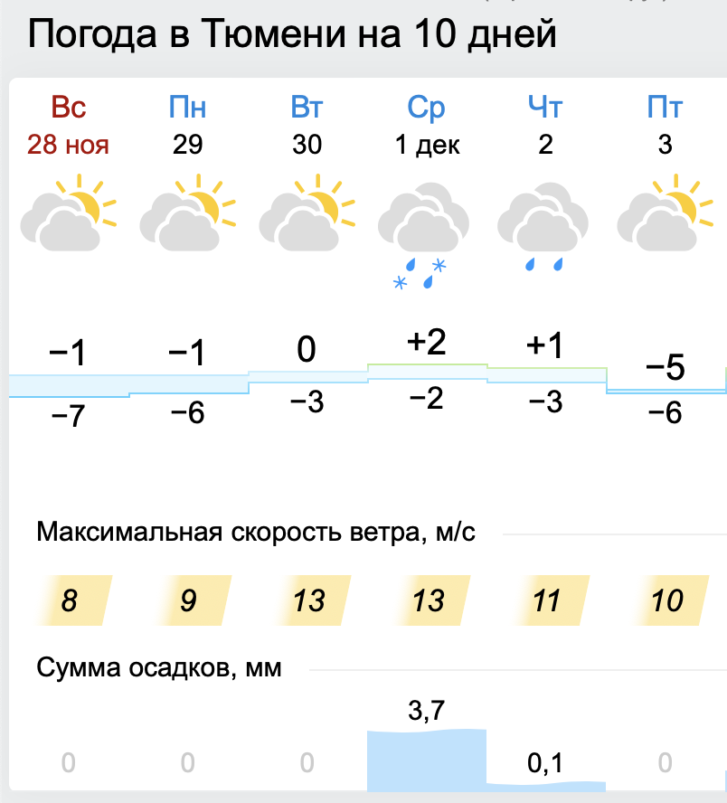 Все дни, за исключением дождливых среды и четверга, тюменцев ждет переменная облачность и высокий ветер. Он поднимется от минимальных 9 в понедельник, 29 ноября, до максимальных 13 метров в секунду во вторник и среду. Только под конец недели его направление сменится с южного на западный.