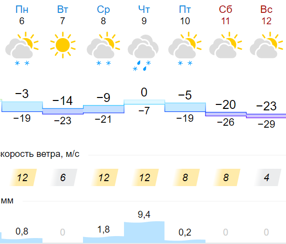 Уже во вторник и среду, 7 и 8 декабря, столбик термометра опустится днем до -14 градусов и в ночное время суток до -23 градусов. А вот в субботу и воскресенье похолодает до -23 и -30 градусов соответственно, сообщает Gismeteo.