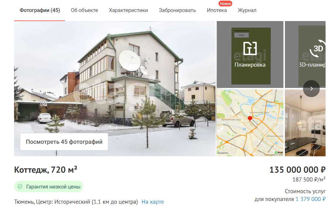Как сообщается на сайте агентства недвижимости «Этажи», этот дом построен в 1996 году. В нем сделан современный ремонт с использованием дорогостоящих материалов европейского производства. Собственник продает коттедж за 135 миллионов рублей. В объявлении есть пометка о том, что помещение можно использовать для организации предпринимательской деятельности в различных сферах.