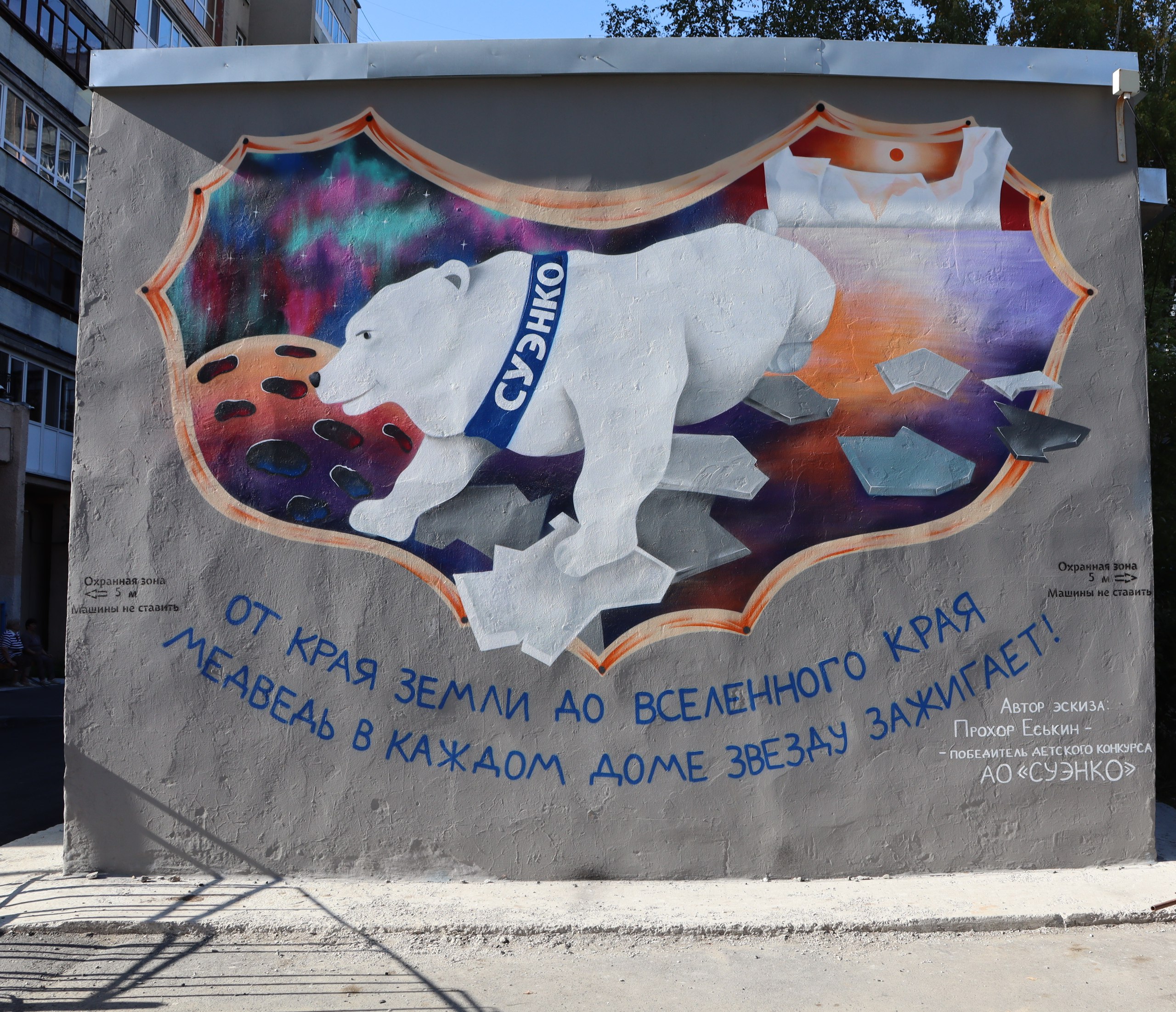 Эскиз белого мишки создал 14-летний тюменец, который стал победителем конкурса рисунков для детей сотрудников энергетической компании «СУЭНКО». Его работа была перенесена на стену трансформаторной подстанции с помощью кисти профессионального художника. Всего на конкурс было подано порядка 300 эскизов.