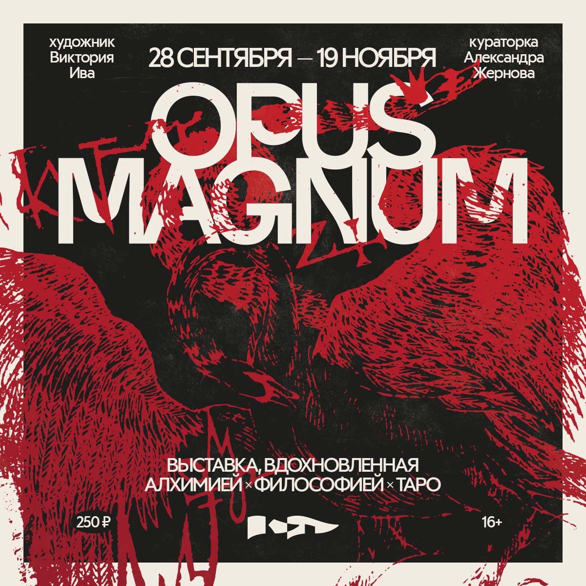 Выставка Opus Magnum представляет собой экспозицию, которая состоит из двух частей. Первая — гравюры на картоне по средневековым алхимическим циклам и картам Таро, вторая — масляная живопись на холсте, работы из серии Bones и «Лес». Автором этого проекта является художница и иллюстратор Виктория Ива. Она будет присутствовать на открытии и расскажет посетителям подробнее о своей работе.
