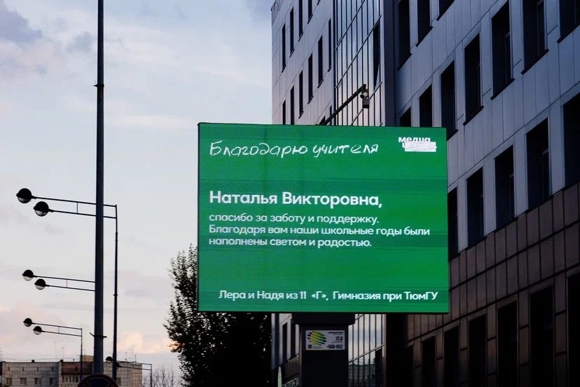 Увидеть 25 пожеланий и слов признательности можно на экранах возле ТЦ «ЦУМ», ТРЦ «Галерея Вояж», ТРЦ «Гудвин», ТРЦ «Премьер», ТЦ «Калинка», ТРЦ «Сити Молл», ТЦ «Магеллан» и ТЦ «Москва».«Мы хотели поместить на билборды абсолютно все полученные “спасибо” — настолько душевными оказались пожелания. Приятно осознавать, что ученики не забывают своих педагогов — с теплотой вспоминают уроки и благодарят за все, даже будучи взрослыми», — рассказала руководитель Медиацентра Валерия Иванова.