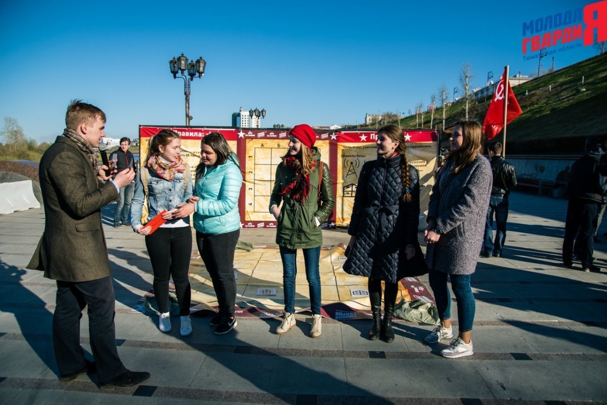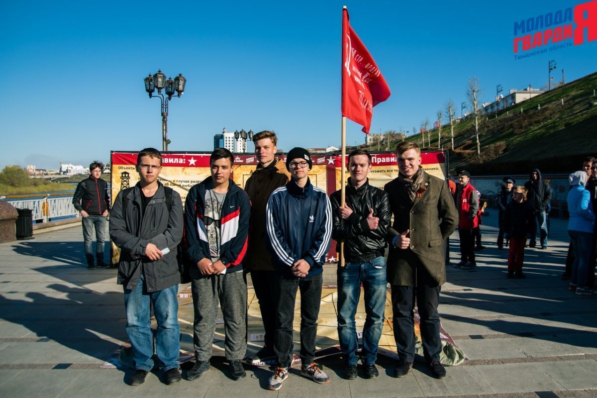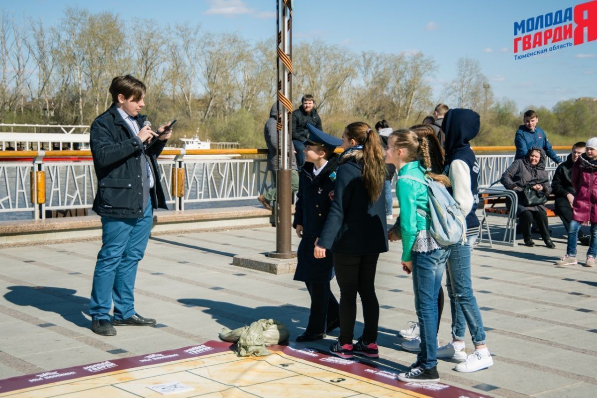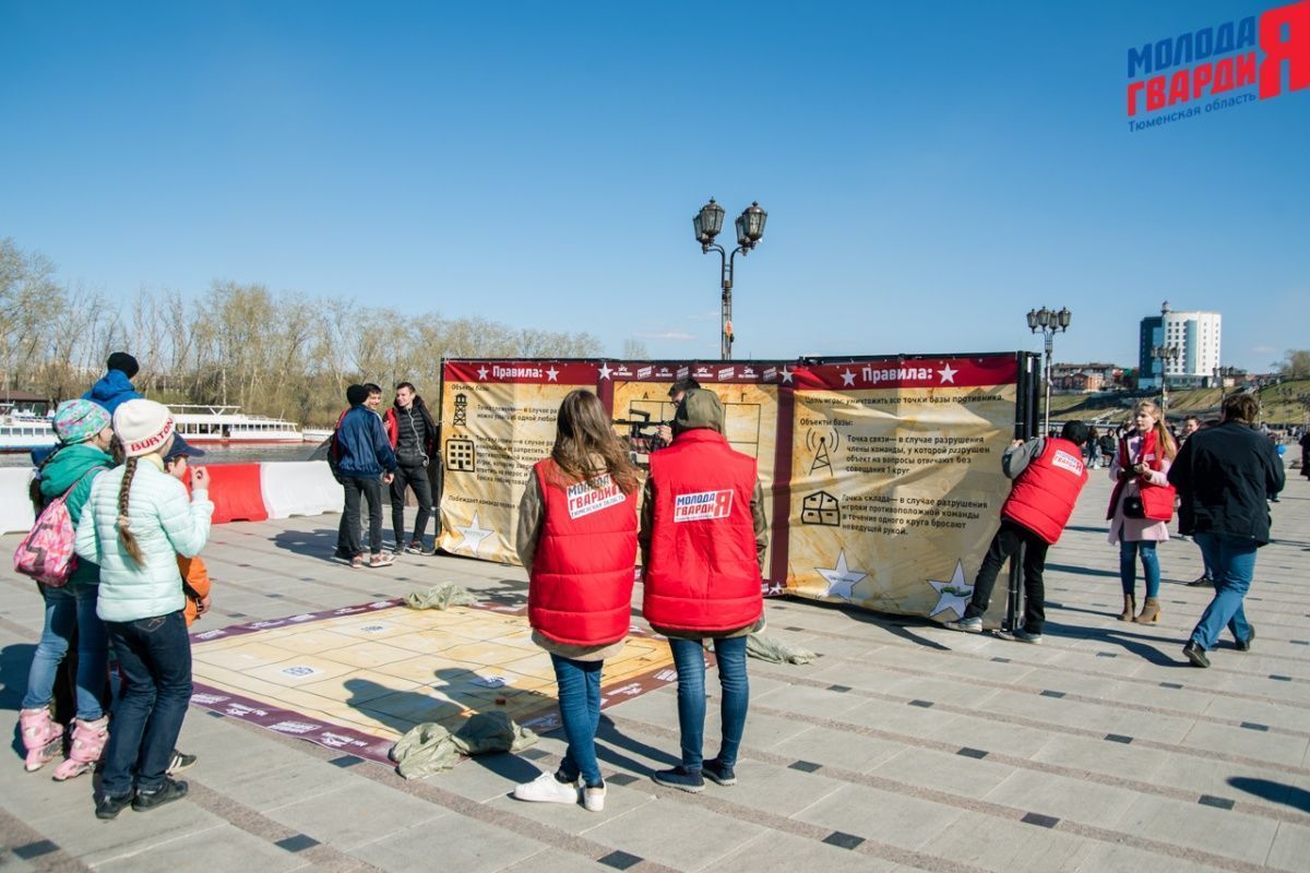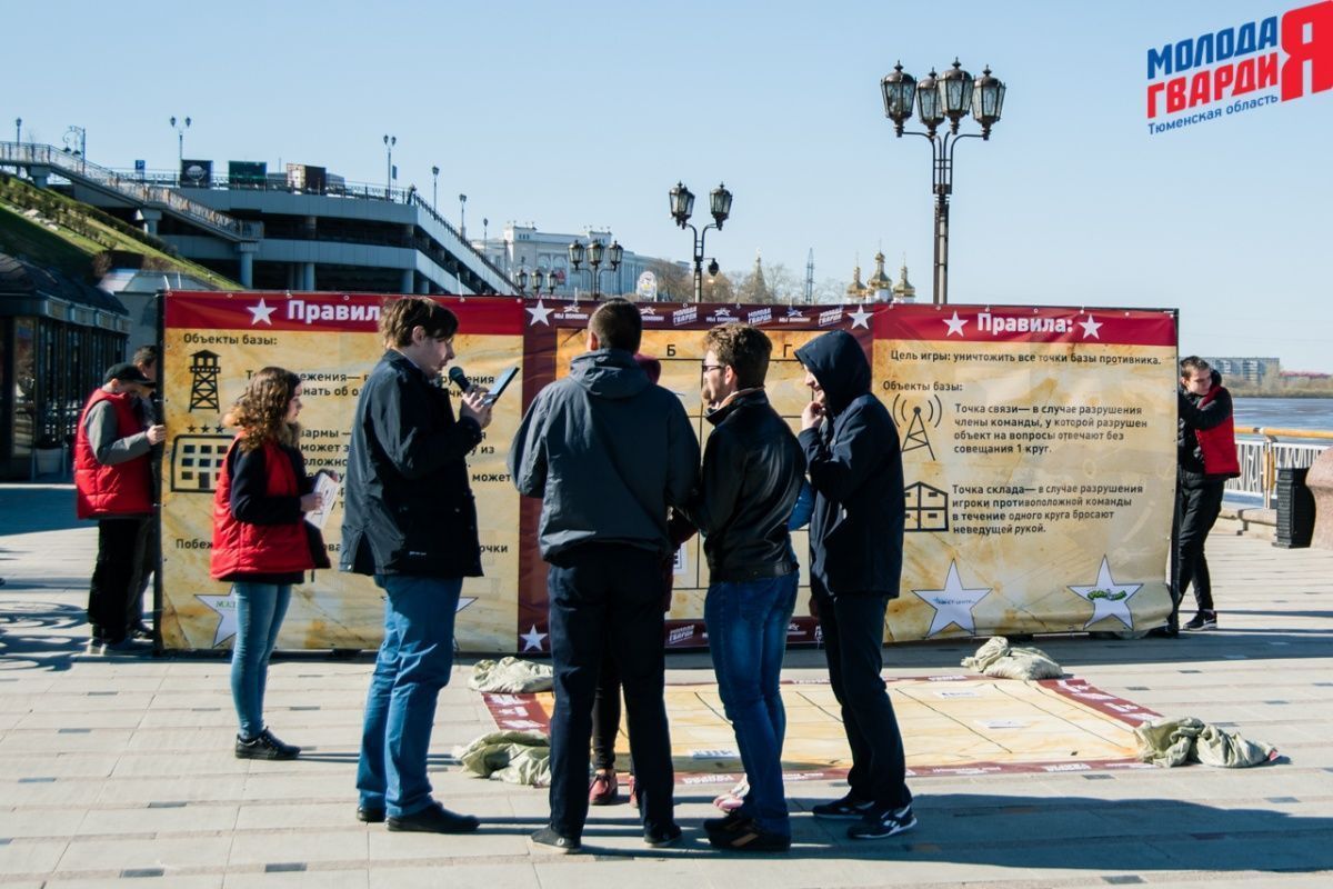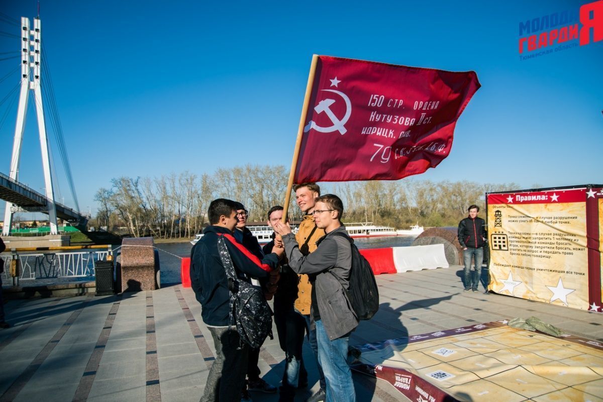 Игра «Знамя Победы» состоялась на Набережной города Тюмени. В ходе игры команды из 5 человек отвечали на тематические вопросы о Великой Отечественной войне и всеми силами попытались разрушить штаб и опорные пункты противника. Игра прошла на втором ярусе Набережной, лучшим командам были вручены призы и памятные подарки, а победители примут участие в водружении знамени Победы.