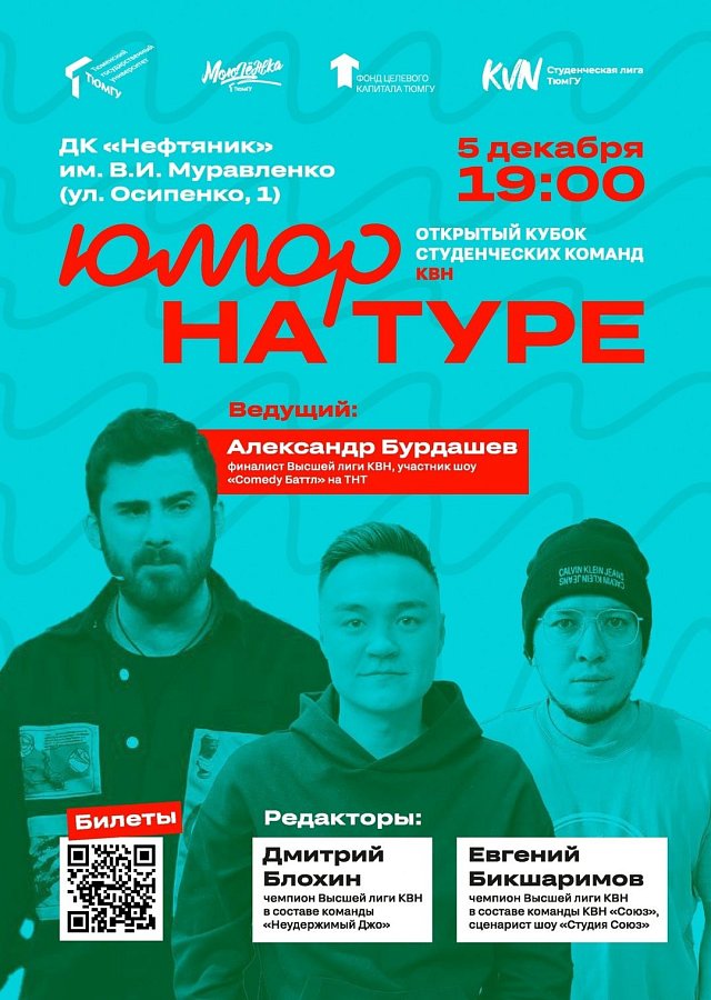 5 декабря в 19:00 во Дворце культуры «Нефтяник» (ул. Осипенко, 1) Тюменский государственный университет организует открытый кубок студенческих команд КВН «Юмор на Туре». В нем примут участие более 30 студенческих команд со всей России, которые поборются за призовой фонд в размере 210 тысяч рублей! Также жюри наградят участников в номинациях «Лучшая мужская роль», «Лучшая женская роль» и «Лучшая шутка».